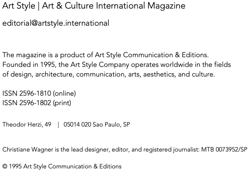 The Art Style, Art & Culture International Magazine was implemented in 2018, with the first issue in March 2019. Publishing in Art Style Magazine is free of charge for anyone. There are no article, essay, or contribution processing charges or other publication fees. Art Style Magazine has been working with the support and collaboration of volunteers willing to contribute to the editorial work and disseminate and promote knowledge in art and culture.