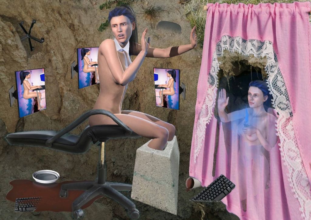 Bringing together works by Casey Kauffmann, Katherine Mills Rymer, Nicoleta Mures and Romain Thibault, UNSTABLE OBJECTS | Online highlights this new era of images and their power to reflect our fragmented, hybrid, hyper-stimulated selves. Either taken from popular culture or created from scratch, distorted upon themselves or remixed in the primordial swirl of the internet, the works on display stand as a form of critique and celebration. Romain Thibault’s project “Cognitive Distortions” is about automatic thought patterns that cause individuals to perceive reality inaccurately and negatively. This phenomenon is explored through the lens of our current image culture. Katherine Mills Rymer’s sister works “Face Like A Cave” and “Hairy Melty” explore ideas of the socialized self, the private self and the paradisiacal online self. Each work seeks to understand internal shame, infinite circularity and digital entanglement. Casey Kauffmann’s “Cursed AF” series of GIFs explore the concept of cursed content, a type of online content and popular subculture that is considered disturbing, unsettling or even frightening. Nicoleta Mures’ collages explore the overwhelming nature of our always-connected society, highlighting the alienation that comes with living in a world where we are always online but never truly present. The artworks are placed in dialogue with a virtual environment architecturally designed by Mohsen Hazrati, to recall the overflowing and breached out stream of the web.