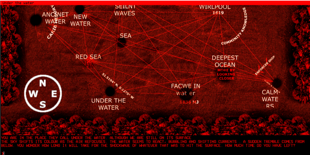 In Danielle Brathwaite-Shirley’s THE OCEAN REMEMBERED YOUR BODY, players navigate a text-based video game that explores identity and memory. The ocean serves as both a metaphor and a physical space, drawing on the artist’s personal history and honoring the narratives of marginalized bodies. Inspired by early text-based adventure games, the piece encourages players to engage deeply with their imaginations, reconstructing the world from their own experiences and histories.