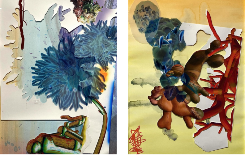 Maja Rohwetter’s collages and paintings establish a poetics of fragmentation. In Paradise #1 and Paradise #2 (2024), as well as in Gemischte Gefühle #19 (2025), paradise appears as a precarious construction, composed of cut-outs, overlays, and ambiguous affective registers. The logic of collage dialogues directly with the aesthetics of digital interfaces, feeds, windows, and layers, while manual execution asserts the corporeal presence of the artist. In In the Vicinity of Life Parts (2011), painting extends beyond the canvas, entering processes of virtualisation that destabilise the analog rather than negating it, transforming the medium itself into a field of ontological inquiry.