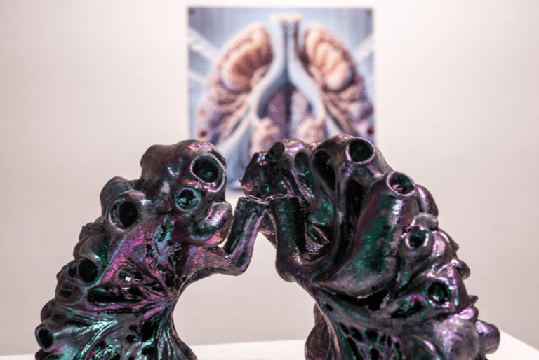 This exploration materialises three-dimensionally in the series Update Us (2025), realised in 3D printing. Glandula Empathiae, Memoria Triplex, and Glandula Dissolutrix designate fictional organs, as if the human body needed to be redesigned to survive a world saturated with informational flows. The AI eye accompanying the visitor from entry to exit functions as an amplified metaphor, an organ without a fixed body, observing, learning, and returning images.