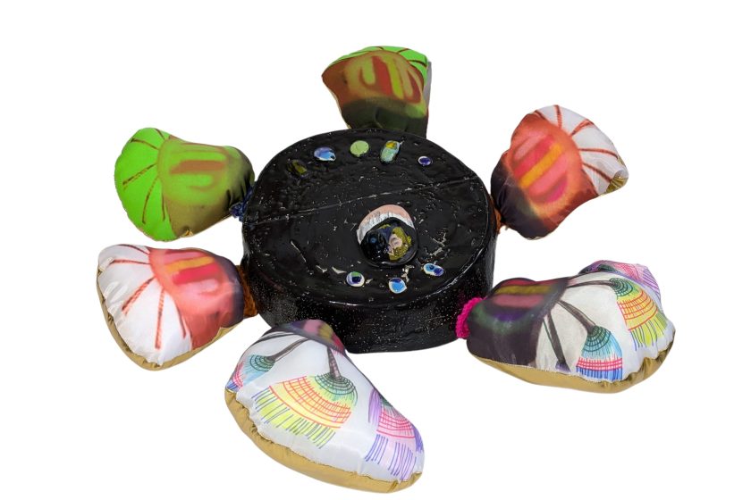 Previous Image Next Image Sweetheart (Robot vacuum), 2024 Ceramics, textile prints on polyester, mixed crochet yarns and filling material, 60 x 60 x 12 cm.